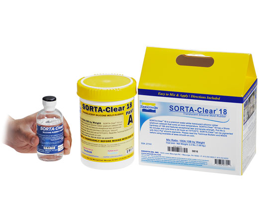 SORTA-Clear™ Series rubbers are premium water white translucent silicone rubbers (platinum catalyst) which cure at room temperature with negligible shrinkage. This product requires a gram scale for measuring parts A + B. SORTA-Clear™ 18 comes in Shore 18A hardness and features high tensile and tear strength.
